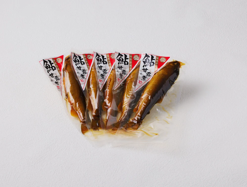 脂の乗った国産の大きなあゆを使用し、弱火でじっくりと時間をかけて煮あげました。頭からしっぽまでまるごと食べられます。