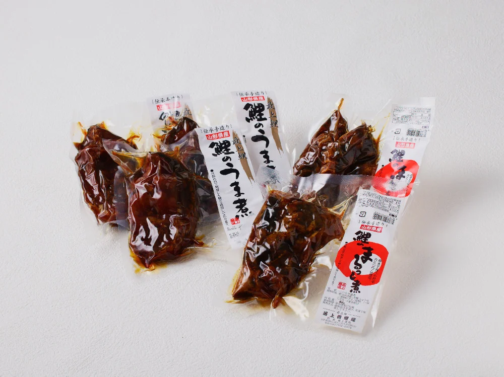 最上鯉屋さんの人気商品を一度に楽しめる、まさに『鯉ざんまい』なセットです。伝統の『うま煮』と、骨まで食べられる『まるっと煮』の両方が入っており、食べ比べができるのが贅沢ですね。それぞれ個包装になっているので、その日の気分に合わせて一品ずつ出せるのも便利。鯉料理の魅力を存分に楽しめる大満足の内容です。
